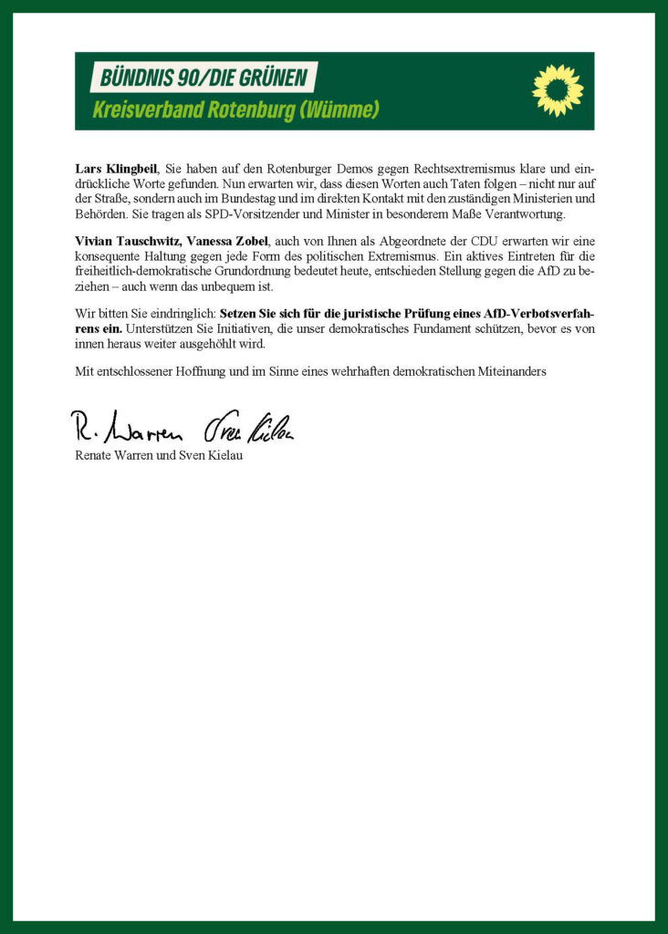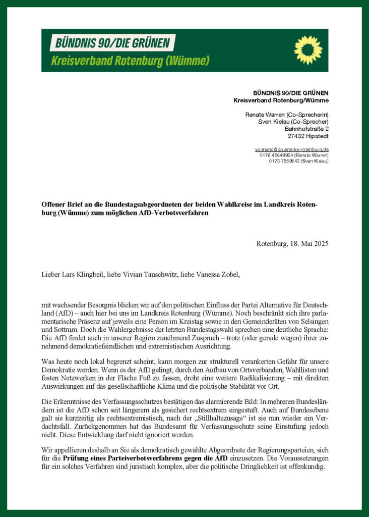 Offener Brief an die Bundestagsabgeordneten 18. Mai 202521. Mai 2025 der beiden Wahlkreise im Landkreis Rotenburg (Wümme) zum möglichen AfD-Verbotsverfahren.